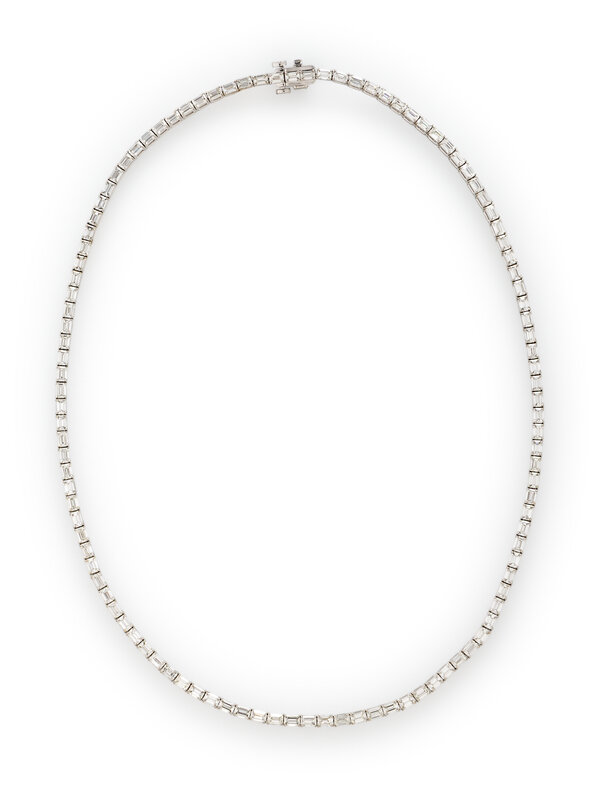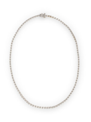 Featuring channel-set baguette cut diamonds weighing 12.30 carats total. Mounted in 18 karat white gold. 16 inches long.