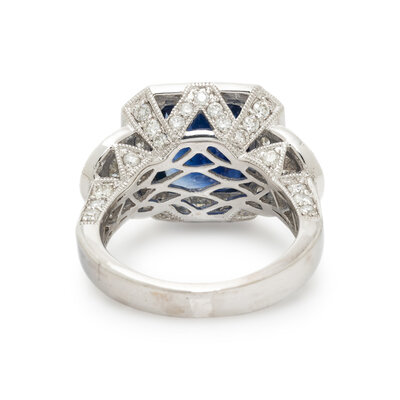 Featuring a cushion cut sapphire weighing approximately 6.75 carats by formula, with round, princess, and half moon cut diamond surround weighing approximately 2.50 carats total. Mounted in 18 karat white gold. Ring size 8 1/2.
