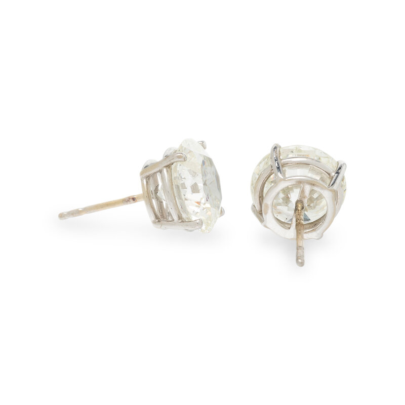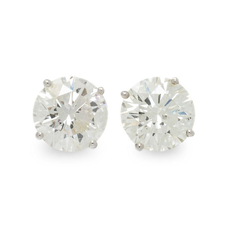 Set with two round brilliant cut diamonds weighing approximately 8.80 carats total. Mounted in white gold. 3/8 inch long.