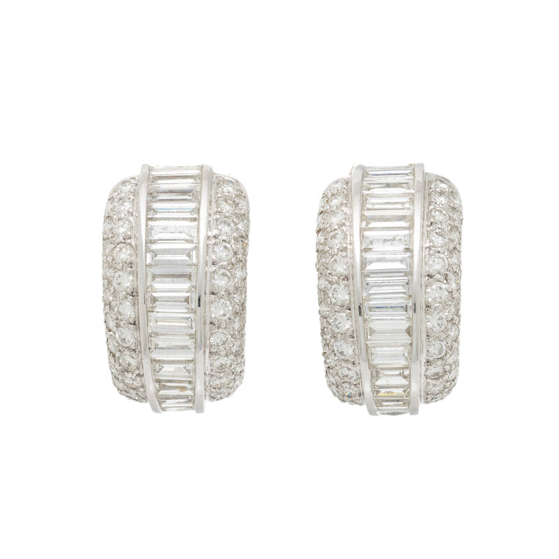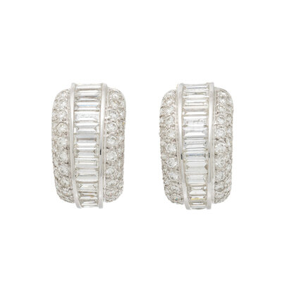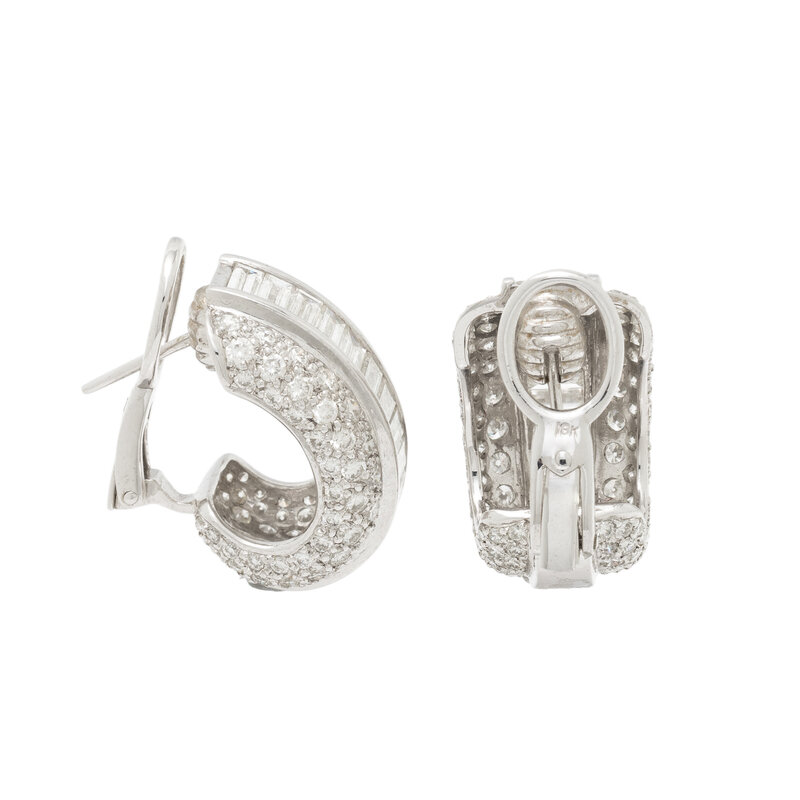 J-hoop design pavé-set with round diamonds with a row of graduating baguette cut diamonds in the center, the diamonds weighing approximately 7.25 carats total, with retractable stud posts. Mounted in 18 karat white gold. 7/8 inch long.