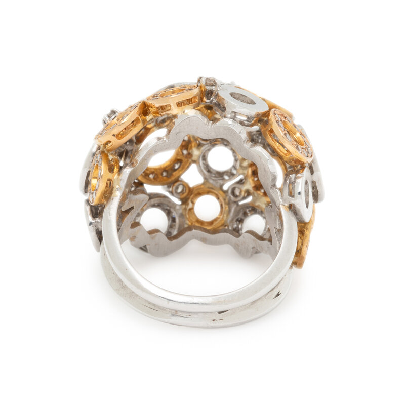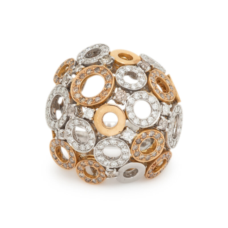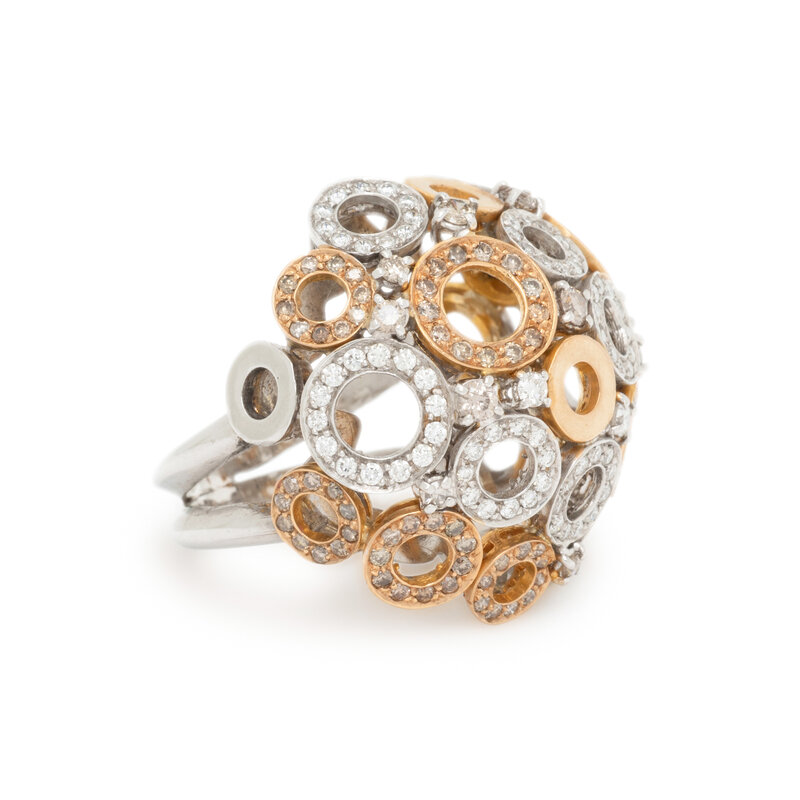Designed as numerous circle motifs set throughout with round diamonds and brown diamonds (origin of color not tested) weighing approximately 1.50 carats total. Mounted in yellow and white gold. Ring size 7 1/2.