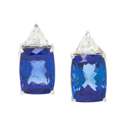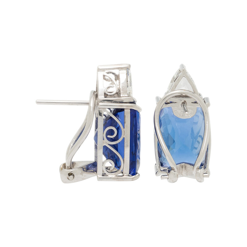 Set with rectangular cushion cut tanzanite weighing approximately 14.50 carats total by formula, accented by trillion cut diamonds weighing approximately 1.00 carat total. Mounted in 18 karat white gold. 3/4 inch long.