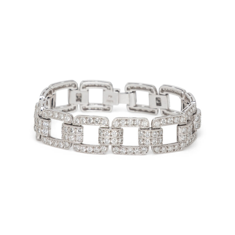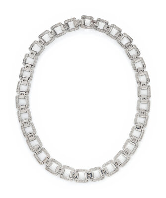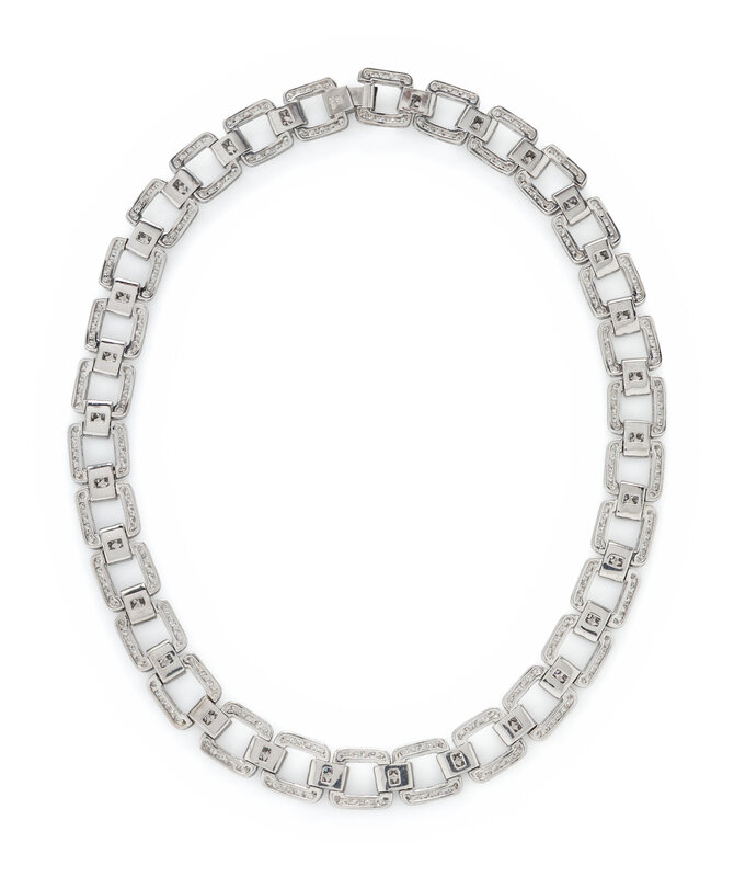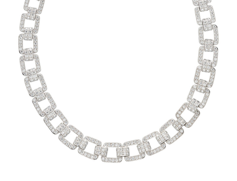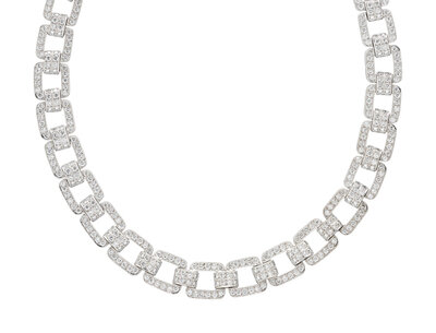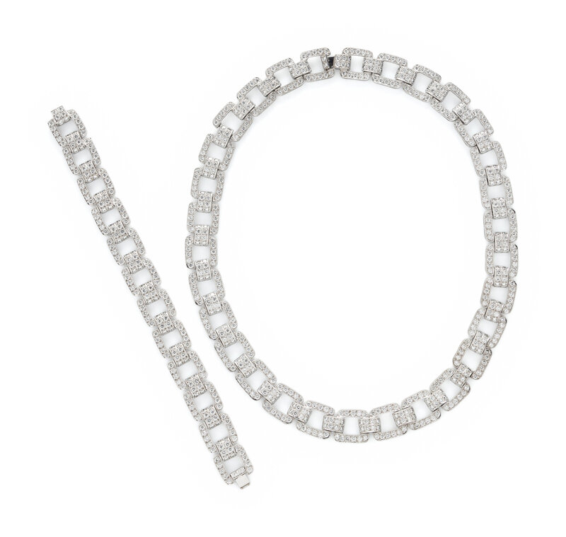 Including a necklace and bracelet designed as squared open links pavé-set with round diamonds weighing approximately 28.50 carats total, the two may be clasped together and worn as a single long necklace. Mounted in 18 karat white gold. Necklace: 16 inches long. Bracelet: 7 inches long.