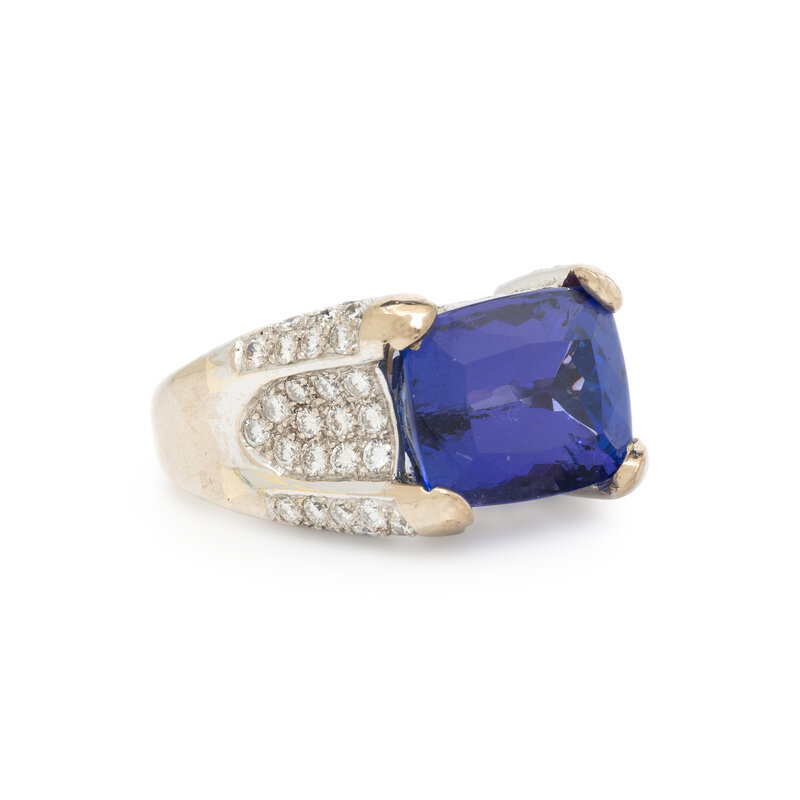Featuring a rectangular cushion cut tanzanite weighing approximately 8.75 carats by formula, with round diamonds set in the shank weighing approximately 0.85 carat total. Mounted in white gold. Ring size 8 1/4.