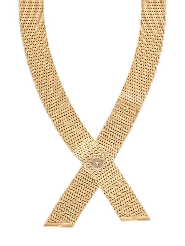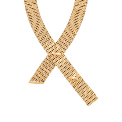 Designed with tightly woven flexible links, may be snapped closed at two different lengths. 14 karat yellow gold. 14 5/8 - 16 1/8 inches long.