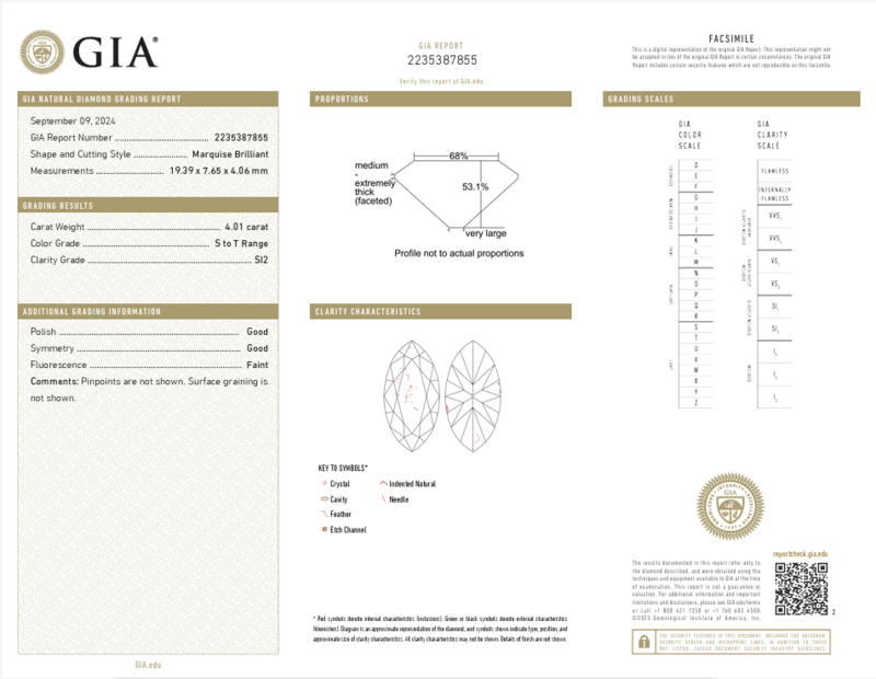 GIA, 2024, Report No. 2235387855, 4.01 carat, S to T color, SI2 clarity, Faint fluorescence