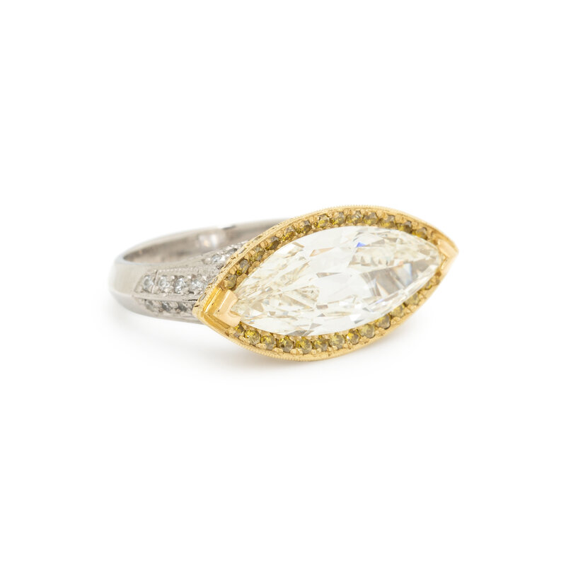 EAST-WEST MARQUISE CUT DIAMOND AND YELLOW DIAMOND RING
