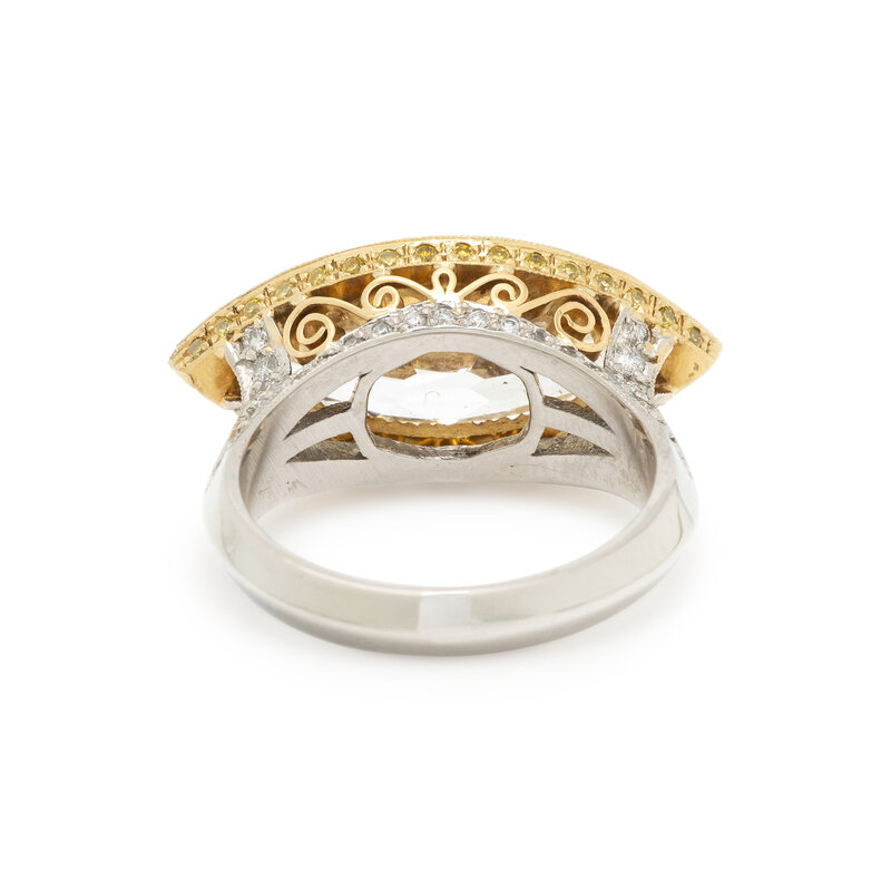 Featuring an east-west set marquise cut diamond weighing 4.01 carats, framed with round yellow diamonds (origin of color not tested) weighing approximately 0.40 carat total and round white diamonds weighing approximately 0.30 carat total, with milgrain and scrolling sides. Mounted in yellow gold and platinum. Ring size 6 1/2.