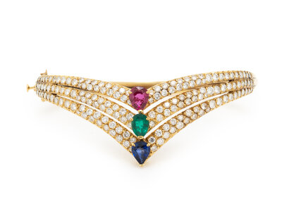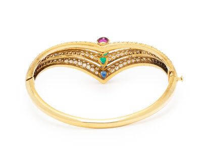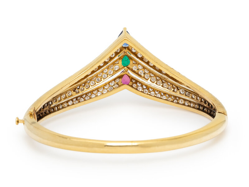 Designed as three rows of round diamonds weighing approximately 4.50 carats total, each coming to a point in the center set with a pear shape sapphire, emerald, and ruby respectively. Mounted in 18 karat yellow gold. 6 1/4 inches inner circumference.