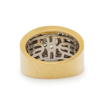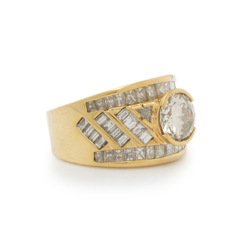 Featuring a bezel set round brilliant cut diamond weighing approximately 2.00 carats, with princess, trillion, and baguette cut accent diamonds weighing approximately 2.20 carats total. Mounted in yellow gold. Ring size 7 1/2.