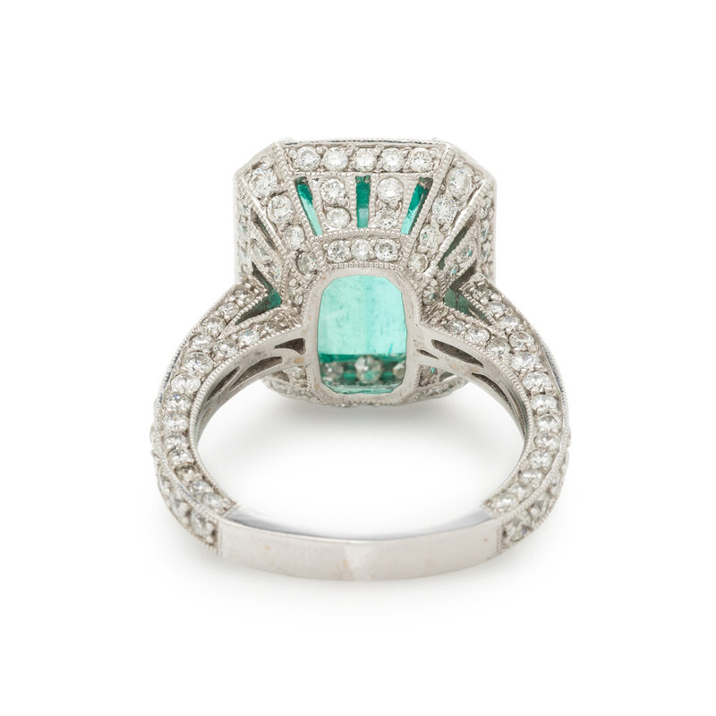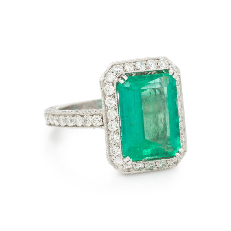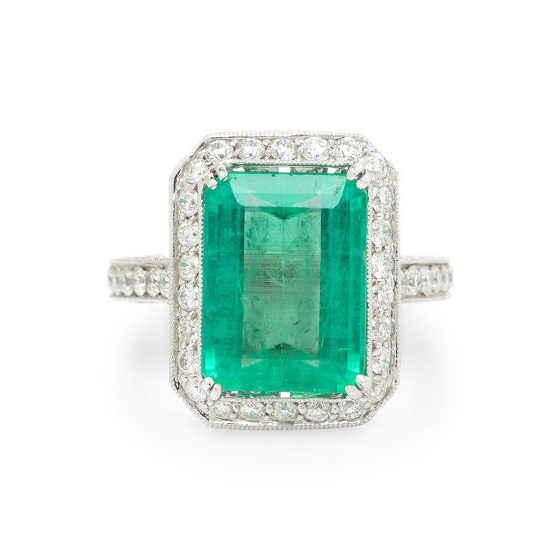 Featuring an emerald cut emerald weighing approximately 6.90 carats by formula, with round diamond surround weighing approximately 2.25 carats total. Mounted in 18 karat white gold. Ring size 8.