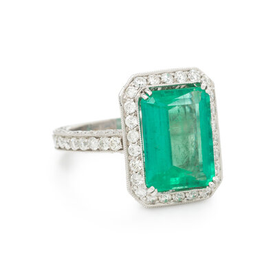 EMERALD, DIAMOND, AND WHITE GOLD RING