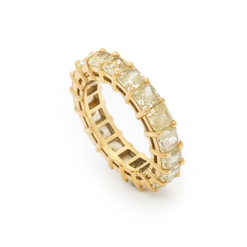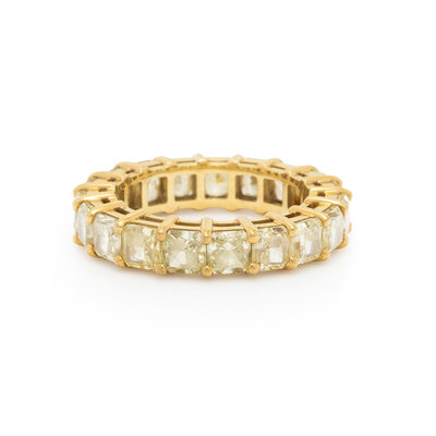 Set with radiant cut yellow diamonds (origin of color not tested) weighing approximately 4.75 - 5.00 carats total. Mounted in 18 karat yellow gold. Ring size 6 1/2.