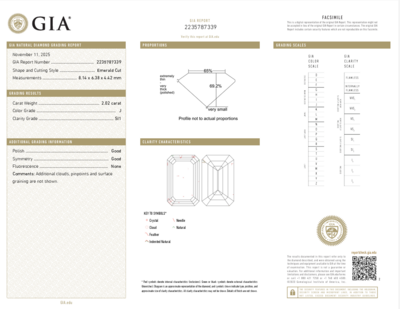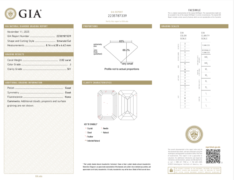 GIA, 2025, Report No. 2235787339, 2.02 carats, J color, SI1 clarity, No fluorescence