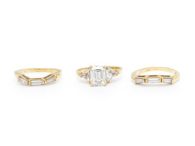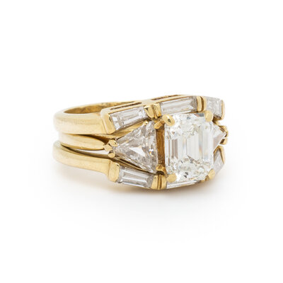 The ring featuring an emerald cut diamond weighing 2.02 carats, flanked by trillion cut diamonds weighing approximately 0.90 carat total, accompanied by a pair of guard rings set with straight and and tapered baguette cut diamonds weighing approximately 0.55 carat total. Mounted in 18 karat yellow gold. Ring size 6 1/4.