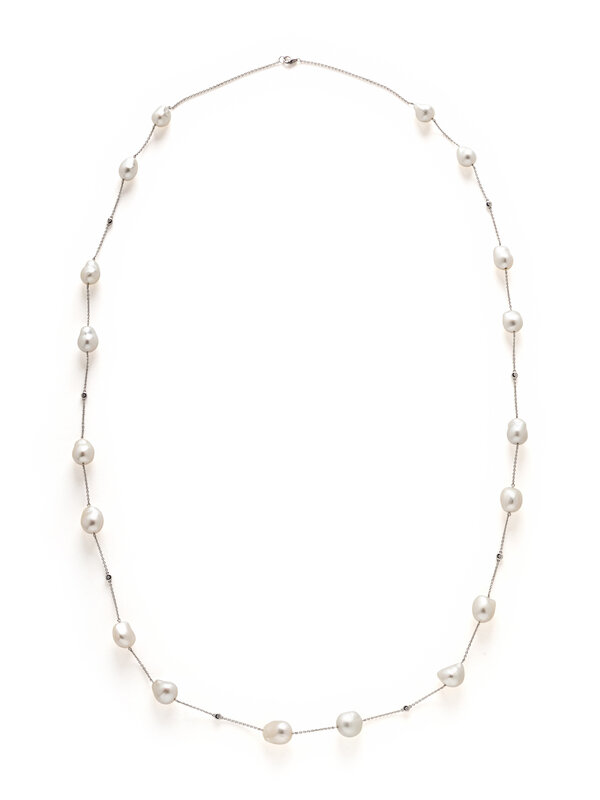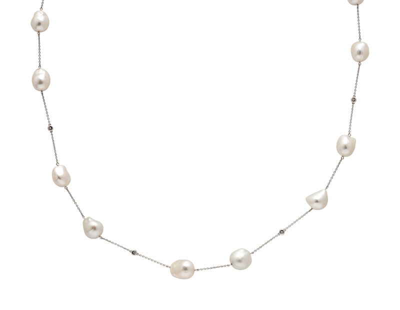 Designed as a station necklace set throughout with baroque cultured pearls measuring approximately 12.70 - 14.70 mm, and bezel set round diamonds. Mounted in 18 karat white gold. 39 1/4 inches long.