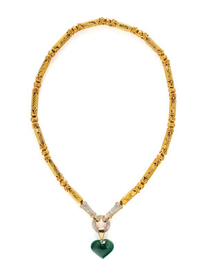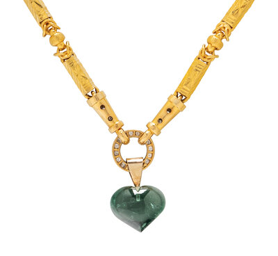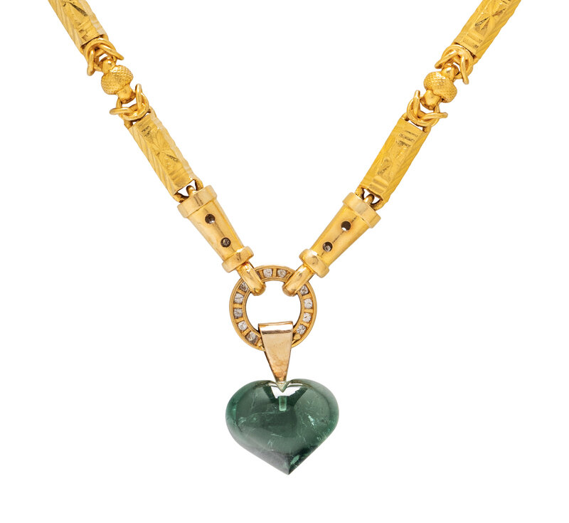 Including a necklace with a convertible clasp set with round diamonds weighing approximately 1.35 carats total and suspending a pendant set with a heart shape green tourmaline, accompanied by an additional necklace in matching byzantine and bar links. High karat yellow gold and yellow gold. Necklaces: 21 and 21 1/4 inches long. Pendant: 1 1/4 inches long.
