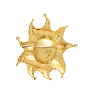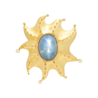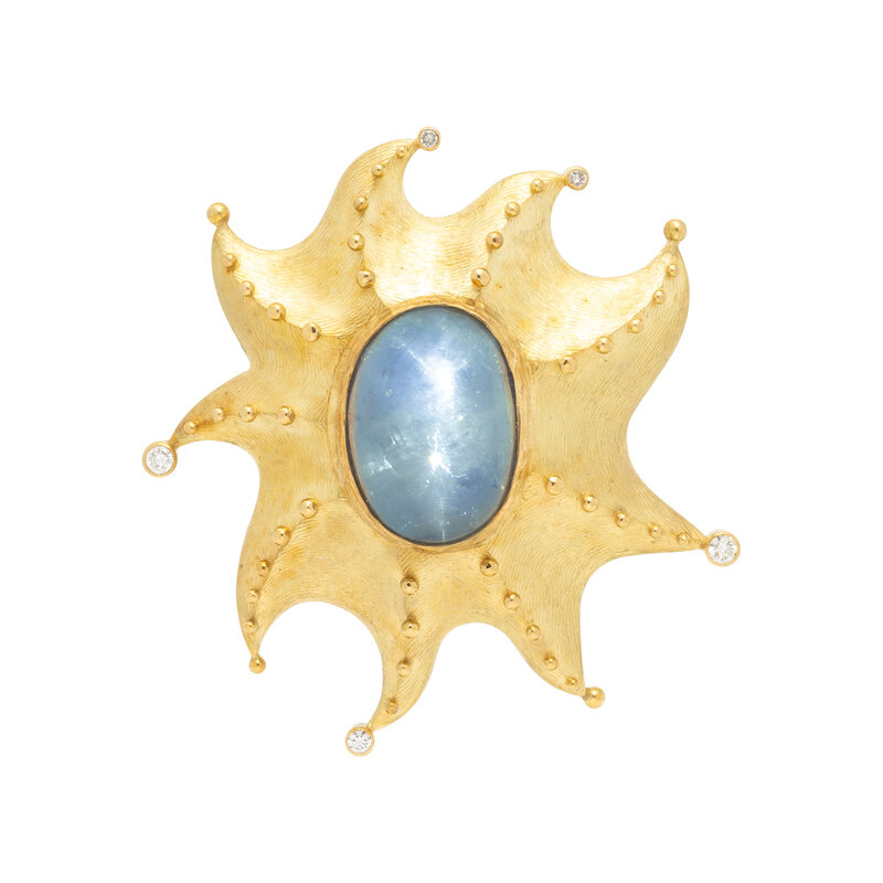 Designed as a sea star, featuring an oval cabochon sapphire measuring approximately 22.55 x 16.00 mm, accented with five round diamonds. Mounted in etched yellow gold. 2 3/8 x 2 3/8 inches.