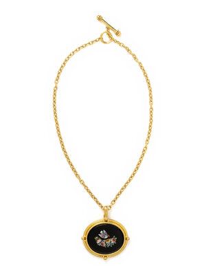 The pendant featuring a micromosaic depicting a bird and flowers, set in onyx, on a cable chain with a toggle clasp. Mounted in hammered 18 karat yellow gold. Pendant: 2 1/8 x 1 7/8 inches. Chain: 17 1/4 inches long.
