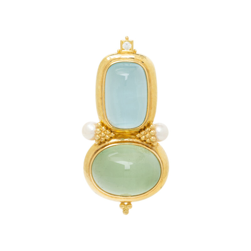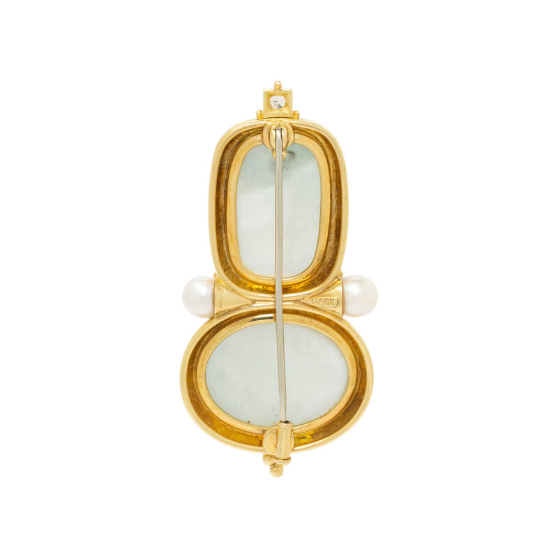 Set with oval and cushion cabochon cut aquamarine and green beryl backed by mother-of-pearl, with accents of cultured pearls and a round diamond weighing approximately 0.13 carat. Mounted in 18 karat yellow gold. 2 3/4 x 1 1/4 inches.