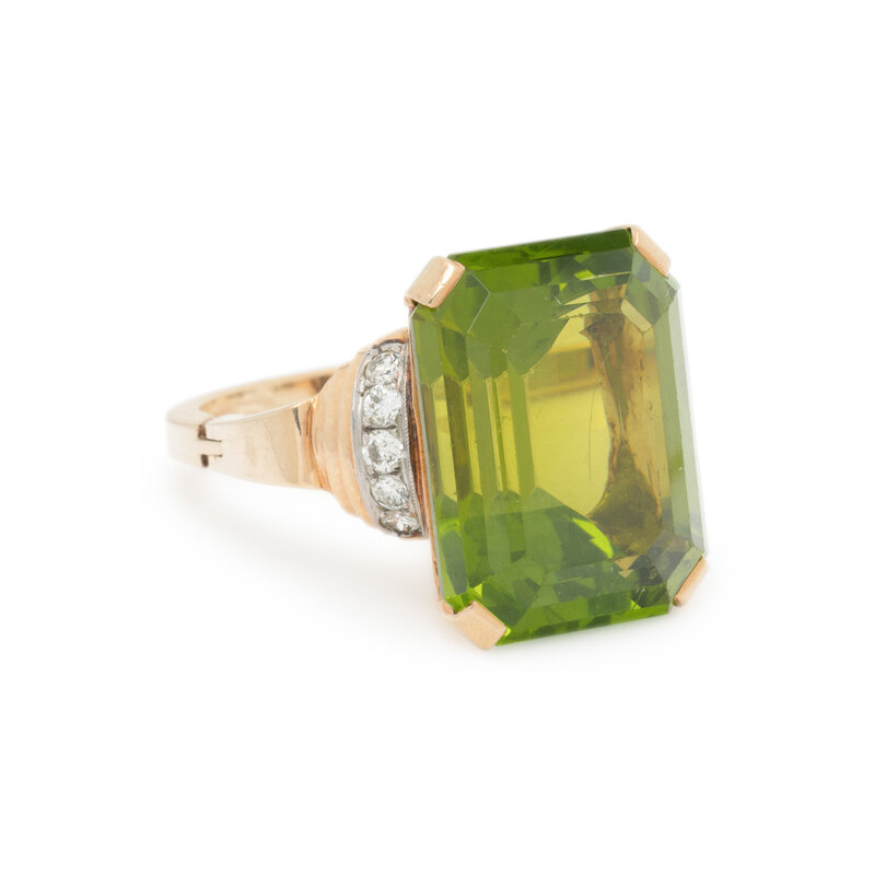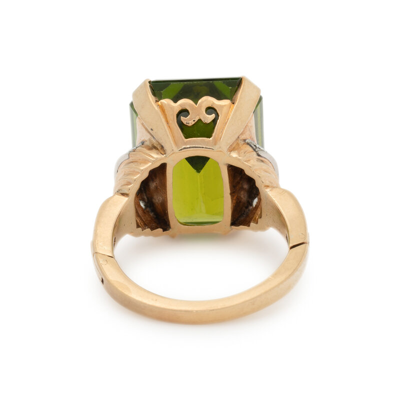 Featuring an emerald cut peridot weighing approximately 29.40 carats by formula, accented by round diamonds weighing approximately 0.30 carat total. Mounted in yellow gold. Ring size 9.