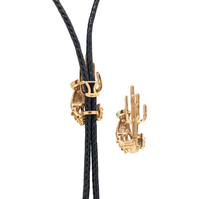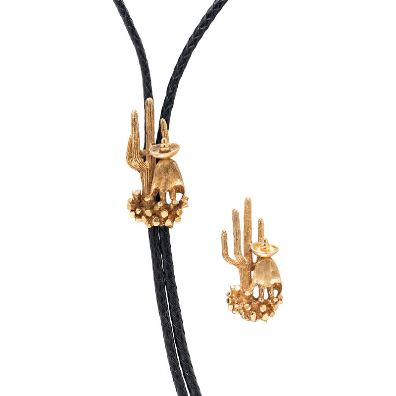 Featuring a bolo tie slide and a brooch, both depicting a man in a sombrero and poncho beside a saguaro cactus, the slide on braided black leather tie with textured gold tips. Mounted in textured 14 karat yellow gold. Slide: 2 1/4 x 1 inches. Brooch: 2 1/4 x 1 inches.