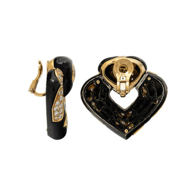 In a spade shape set with black enamel, with swirls of yellow gold pavé-set with round diamonds weighing approximately 4.00 - 5.00 carats total. Mounted in 18 karat yellow gold. 1 3/8 inches long.