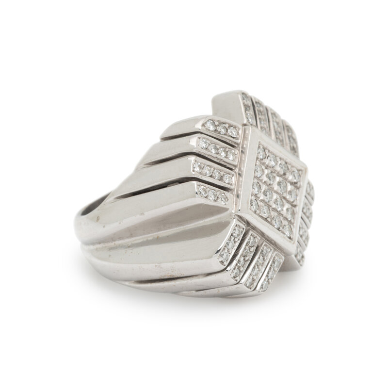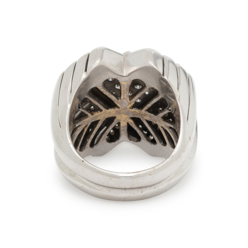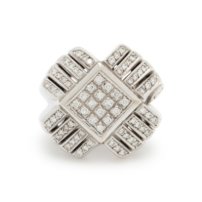 In an 'X' design, with rows of round diamonds weighing approximately 0.50 carat total. Mounted in 18 karat white gold. Ring size 7 1/2.