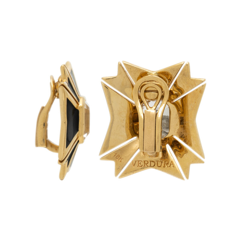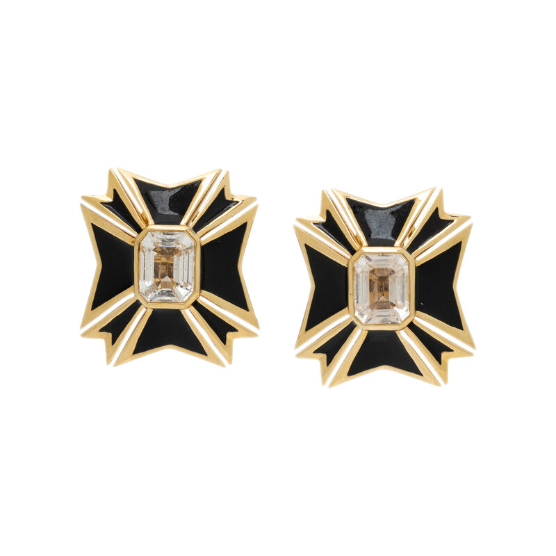 VERDURA, YELLOW GOLD, BLACK ENAMEL, AND WHITE TOPAZ MALTESE CROSS EARRINGS