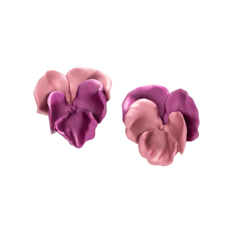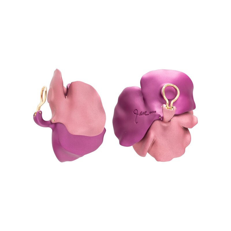 Designed as pansy flowers in contrasting purple and pink finish. Sculpted aluminum with 18 karat yellow gold clip backs. 2 1/8 inches long.