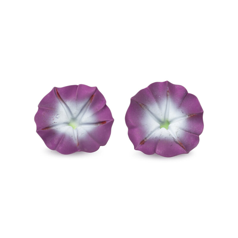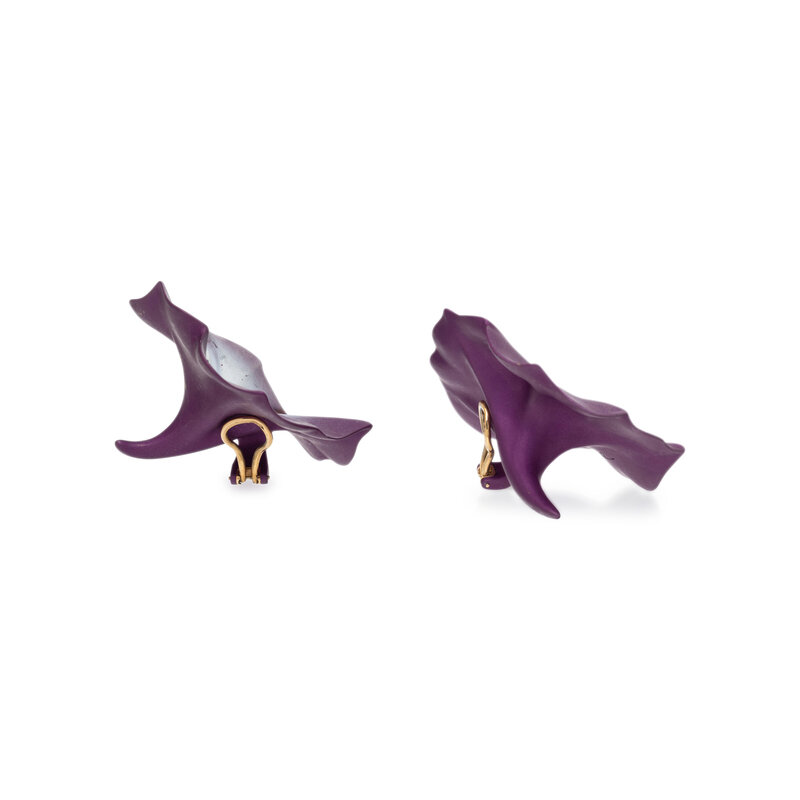 Designed as morning glory flowers in matte purple, white, and green finish. Sculpted aluminum with 18 karat yellow gold clip backs. 2 1/4 inches long.