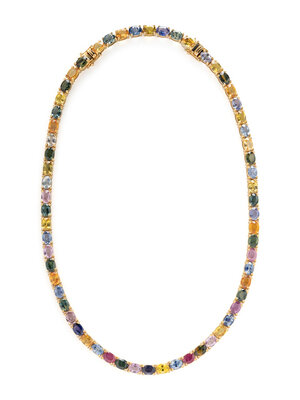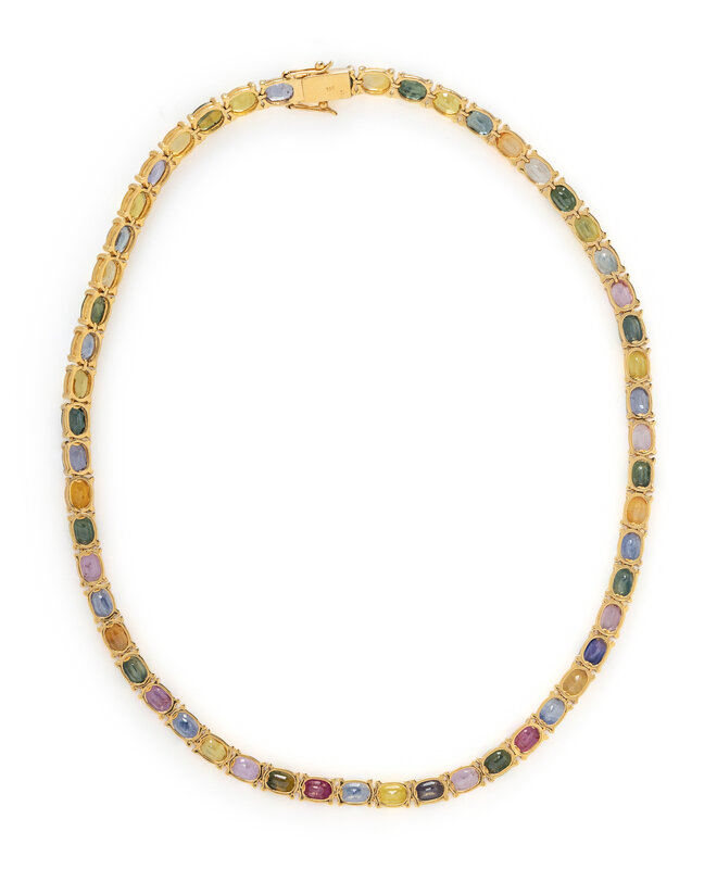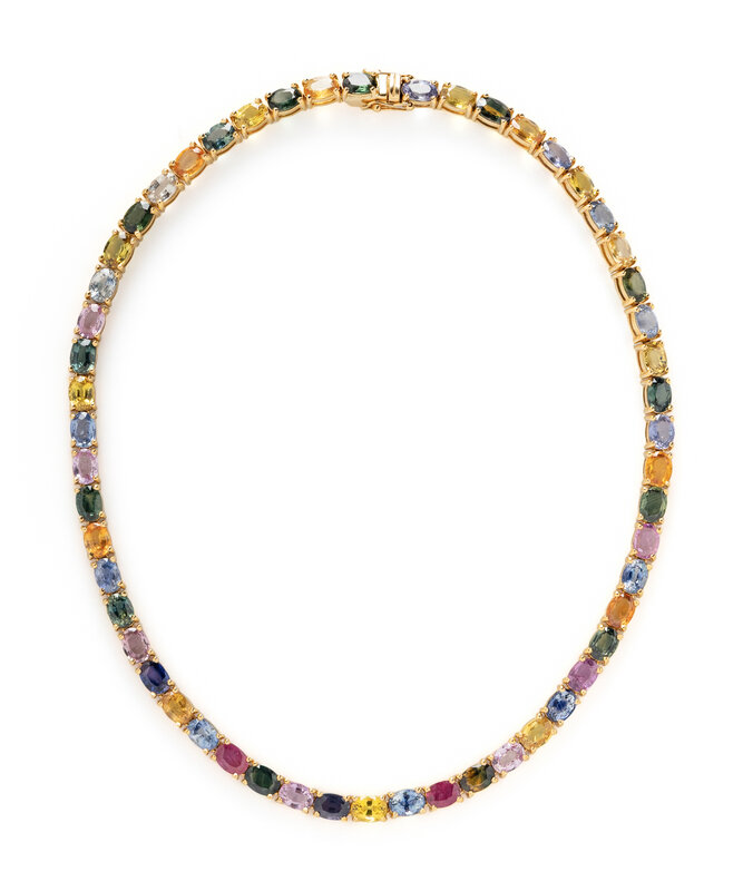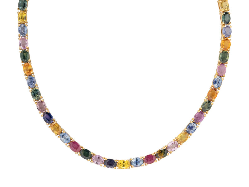 Designed as a line necklace set with variously colored oval rubies and sapphire, including blue, yellow, orange, purple, pink, and green, with an additional extender. Mounted in 18 karat yellow gold. Necklace: 16 inches long. Extender: 2 1/2 inches long.