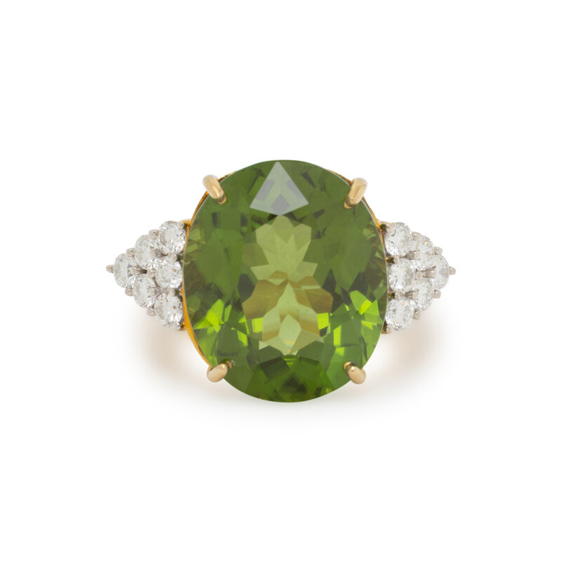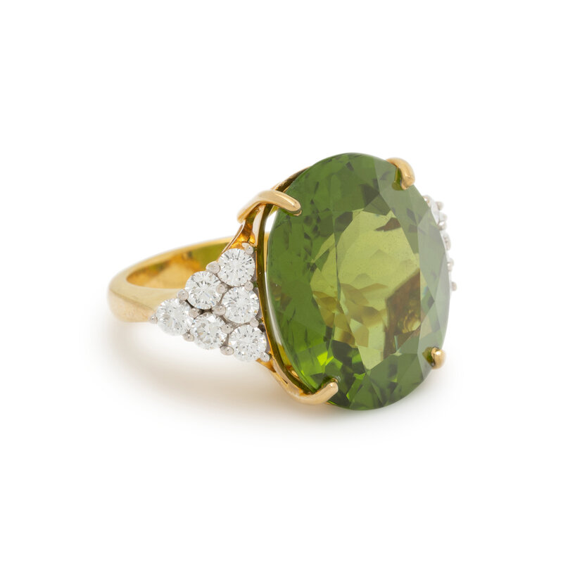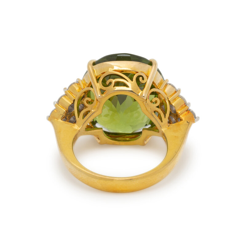 Featuring an oval cut peridot weighing approximately 25.00 carats by formula, flanked by two clusters of round diamonds weighing approximately 1.10 carats total. Mounted in 18 karat yellow gold. Ring size 7 3/4.