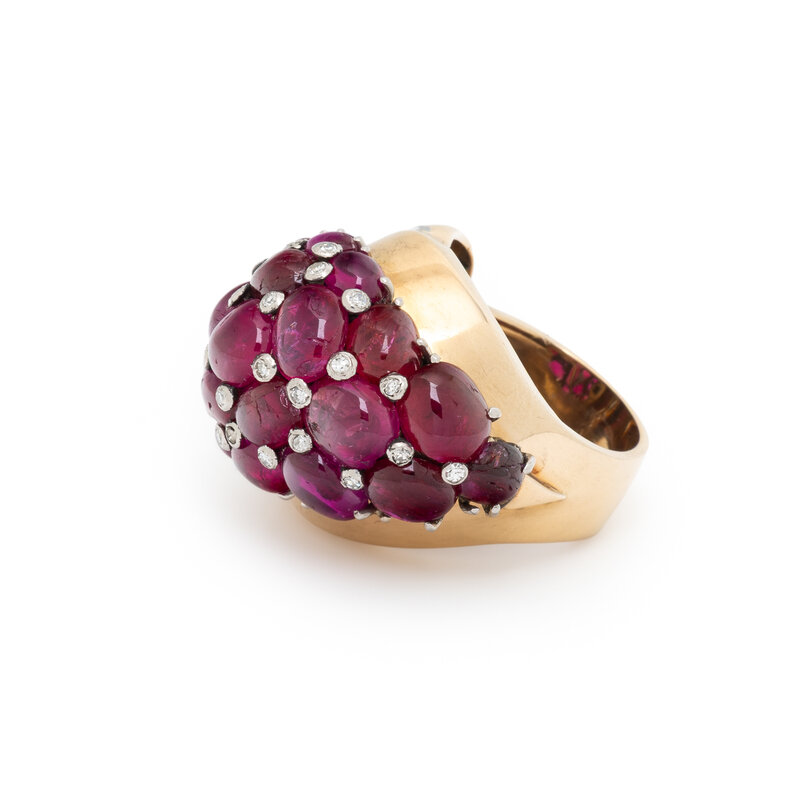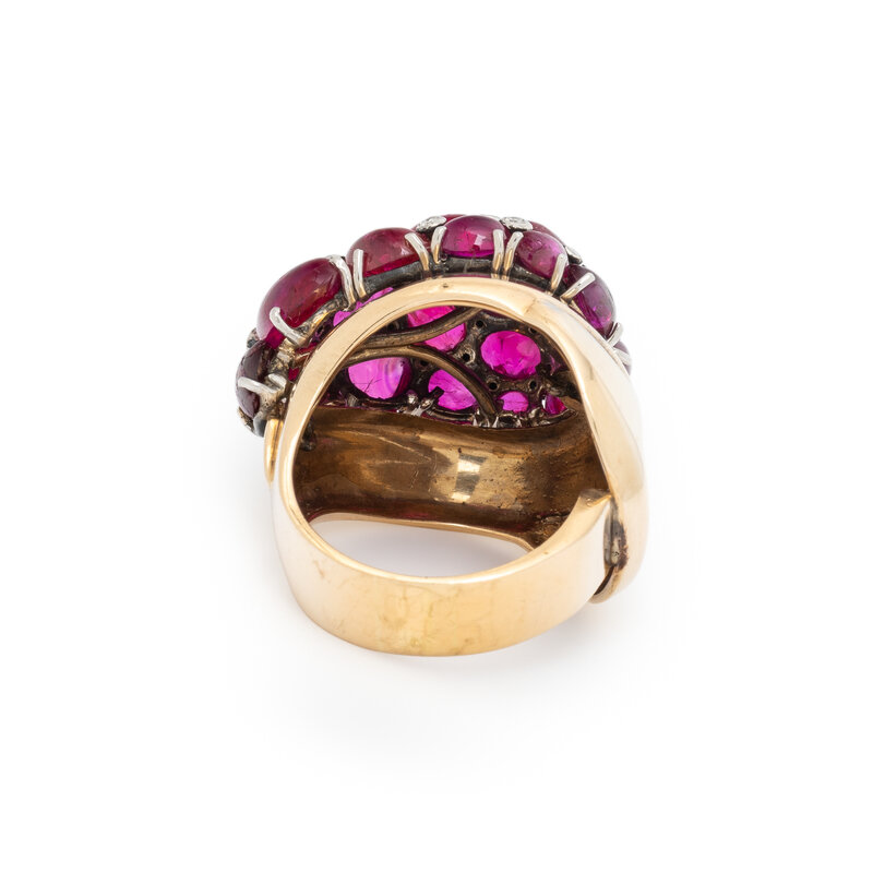Featuring a cluster of oval and round cabochon rubies measuring approximately 3.45 - 5.85 x 3.40 - 6.70 mm, accented with round diamonds weighing approximately 0.40 carat total. Mounted in yellow gold. Ring size 7.