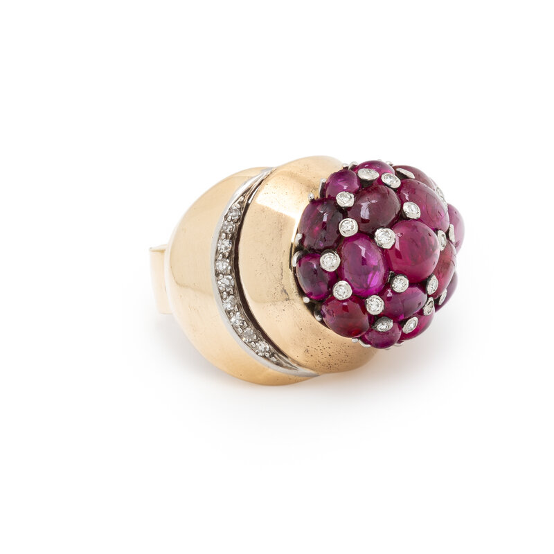 RETRO, RUBY, DIAMOND, AND YELLOW GOLD RING