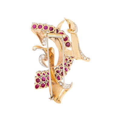 In an abstract monogram design featuring a swath of round and oval cabochon cut rubies, accented by swirls of old European and single cut diamonds weighing approximately 1.75 carats total. Mounted in yellow, rose, and white gold. 2 7/8 x 1 7/8 inches.