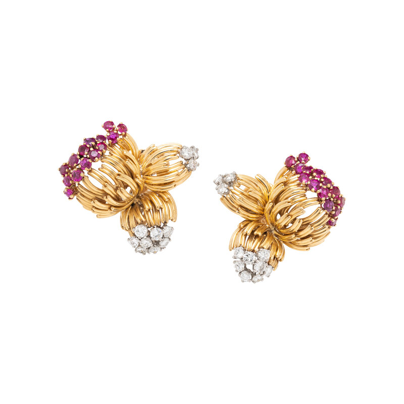 TIFFANY & CO., YELLOW GOLD, RUBY, AND DIAMOND EARRINGS