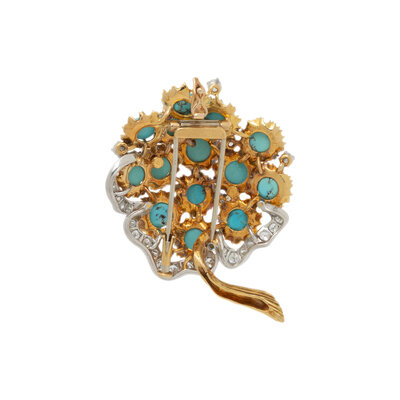 In a floral design, set throughout with round cabochon turquoise and round diamonds weighing approximately 1.40 carats total. Mounted in 18 karat yellow and white gold. 2 x 1 3/8 inches.