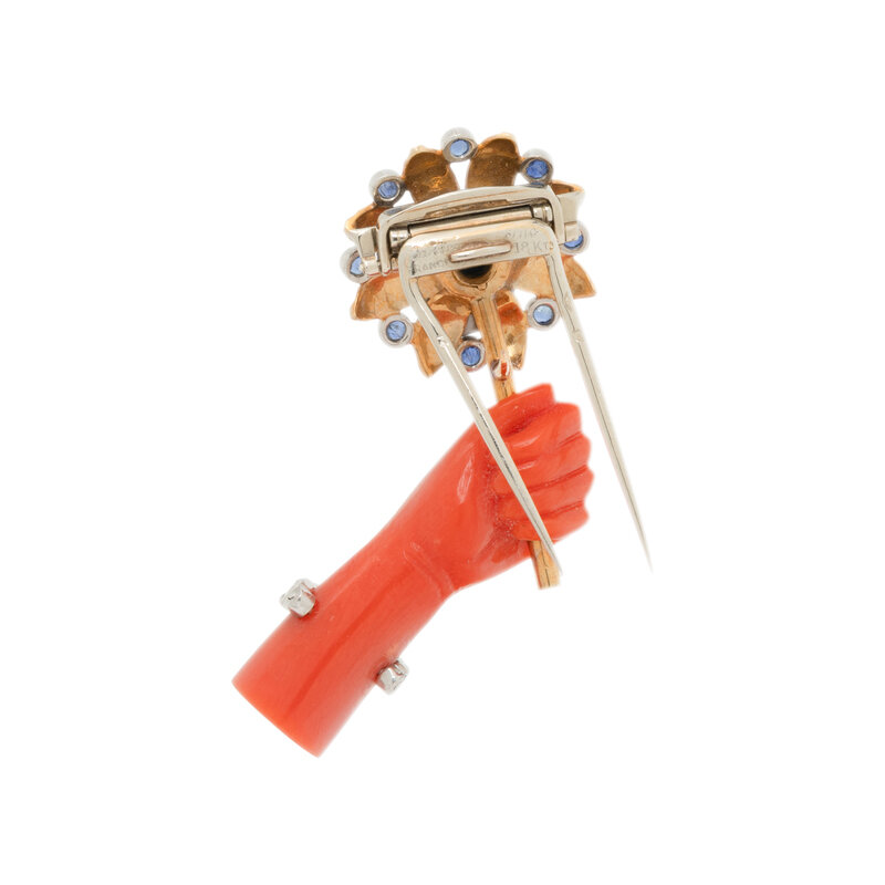 Designed as a carved coral hand holding a flower set with round sapphires and a round cabochon turquoise, the hand wearing a bracelet set with round diamonds weighing approximately 0.20 carat total. Mounted in 18 karat white and yellow gold. 1 1/2 x 1 inches.