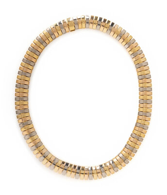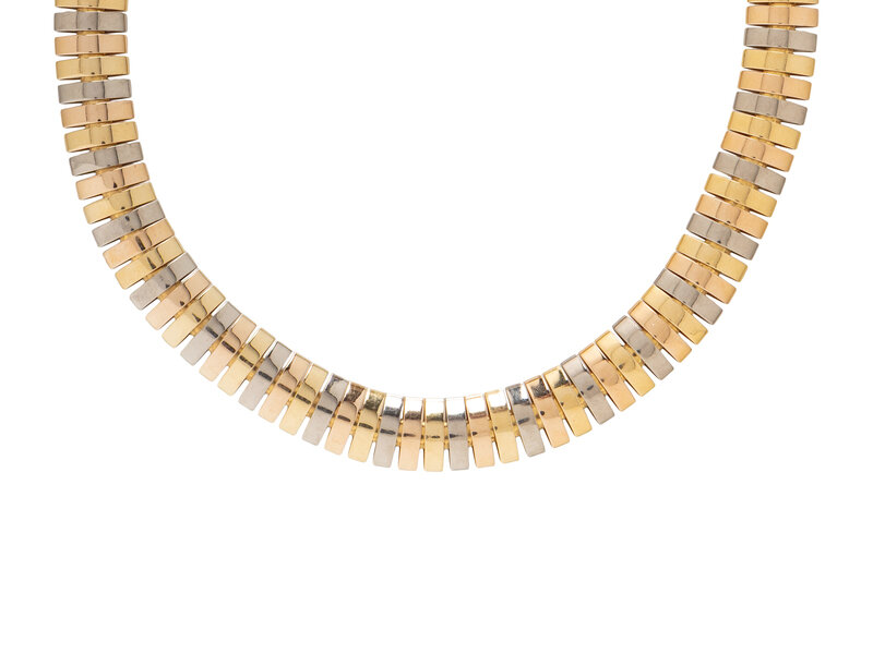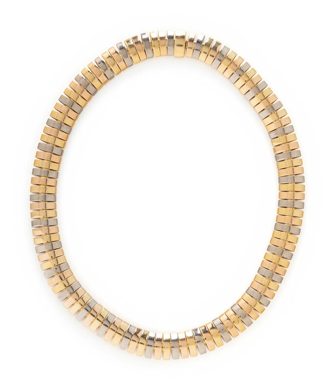 Designed as a highly flexible necklace consisting of yellow, rose and white gold links. 18 karat yellow, white, and rose gold. 15 1/2 inches long, 1/2 inch wide.