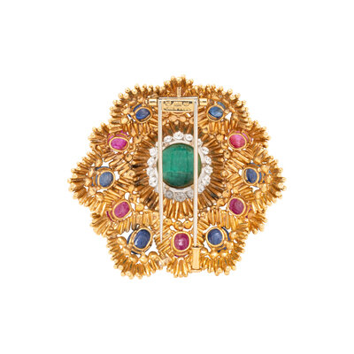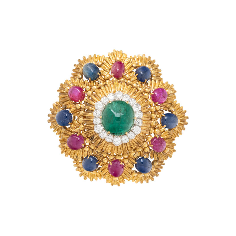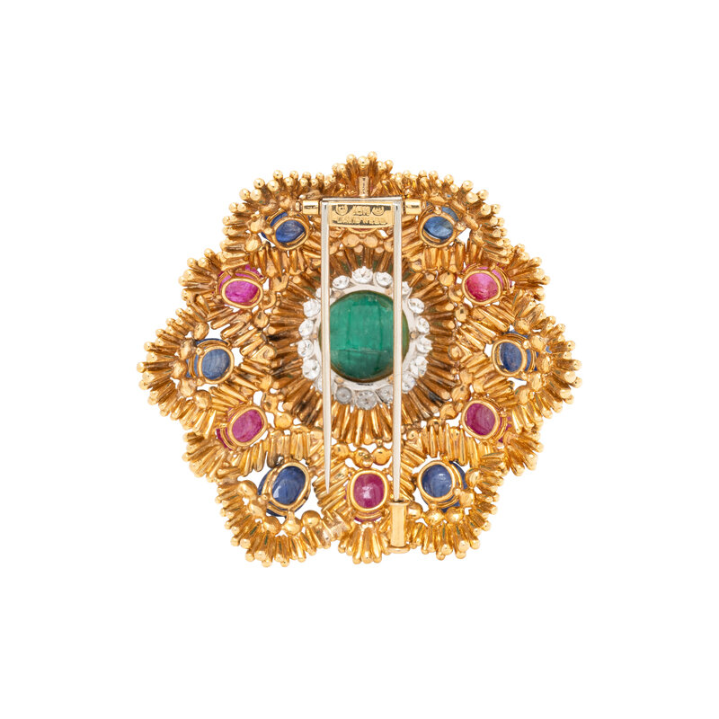 In a radial design of beaded and textured yellow gold, the center set with a round cabochon emerald measuring approximately 14.00 x 13.55 mm surrounded by a halo of round diamonds weighing approximately 1.50 carats total, and alternating oval cabochon rubies and sapphires. Mounted in 18 karat yellow and white gold. 2 1/4 x 2 1/4 inches.