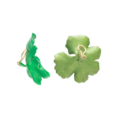 Designed as geranium leaves in contrasting green finish. Aluminum with 18 karat yellow gold clip backs. 2 inches long.