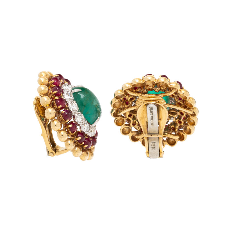 DAVID WEBB, YELLOW GOLD, EMERALD, RUBY, AND DIAMOND EARRINGS