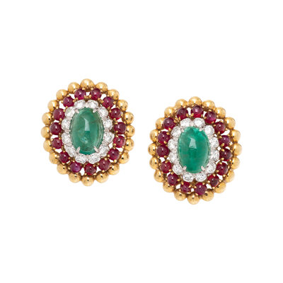 Set with oval cabochon emeralds weighing approximately 7.20 carats total by formula, surrounded by a double halo of round diamonds weighing approximately 1.30 carats total, and round cabochon rubies. Mounted in 18 karat yellow gold and platinum. 1 1/8 inches long.