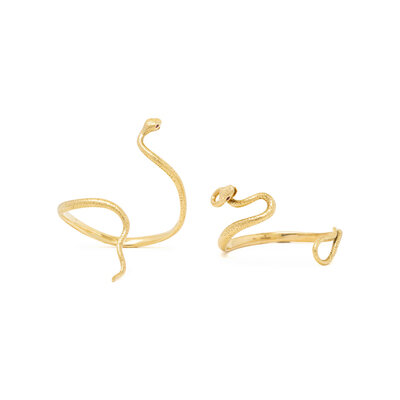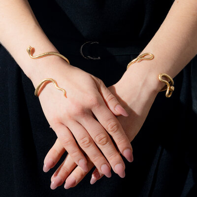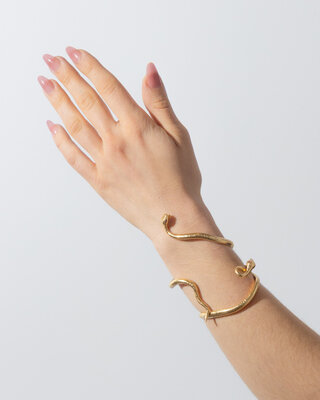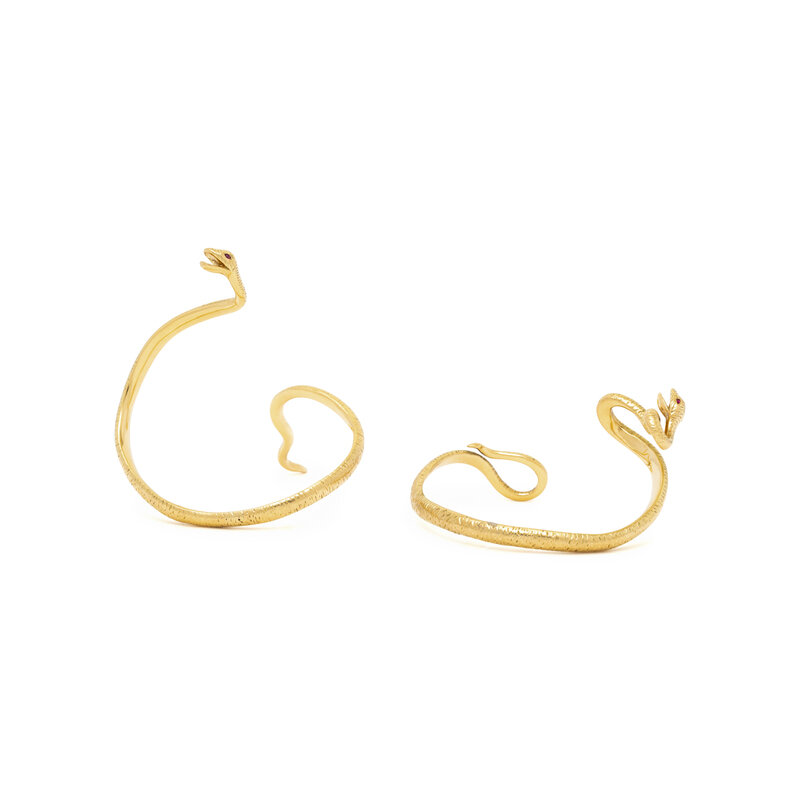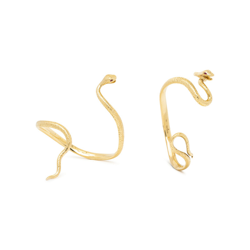 Inspired by Salvador Dali's Medusa brooch, a set of two cuff bracelets designed as serpents with round cabochon ruby eyes from Out of this world, from the Celestial to the Surreal collection, circa 2016. Mounted in textured 18 karat yellow gold. 6 1/2 - 7 inches inner circumference.