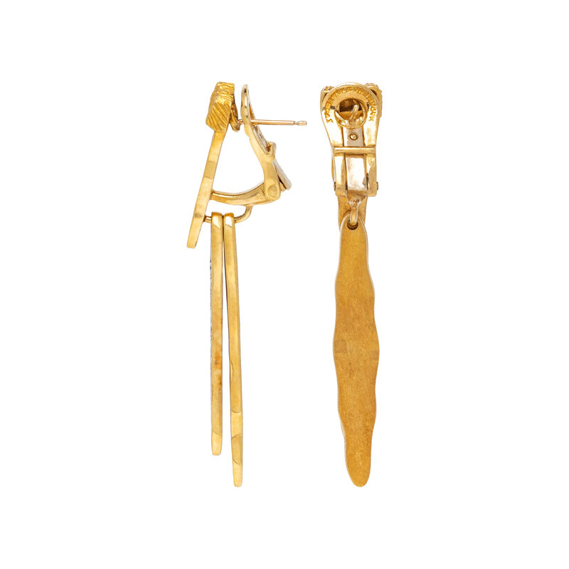 Including a pair of dangle earrings and a hinged bangle in an etched fringe design, the earrings set with round diamonds weighing approximately 0.55 carats total. Mounted in 18 karat yellow gold. Earrings: 2 1/4 inches long. Bracelet: 6 1/2 inches inner circumference.