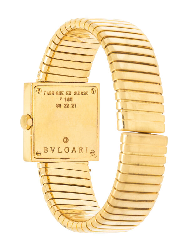 Stamps: Case: (partially obscured) FABRIQUE EN SUISSE F 193 SQ 22 2T. Bracelet: S BVLGARI 750 (Italian hallmark).