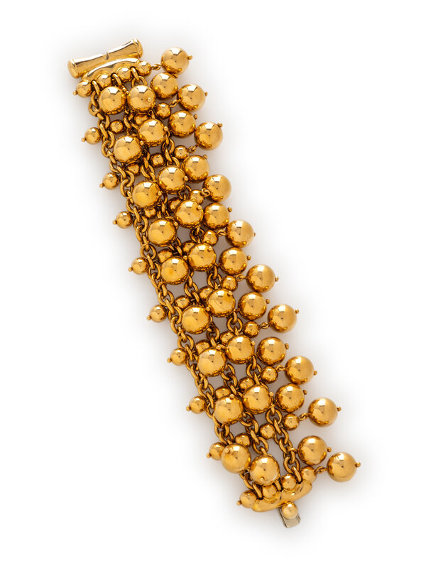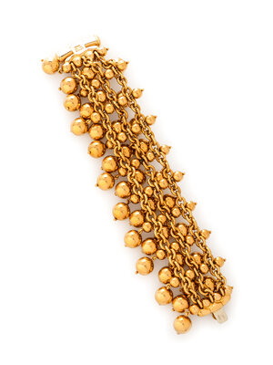 Three connected chains set with spherical beads. 18 karat yellow gold. 6 1/4 inches long.