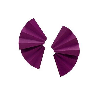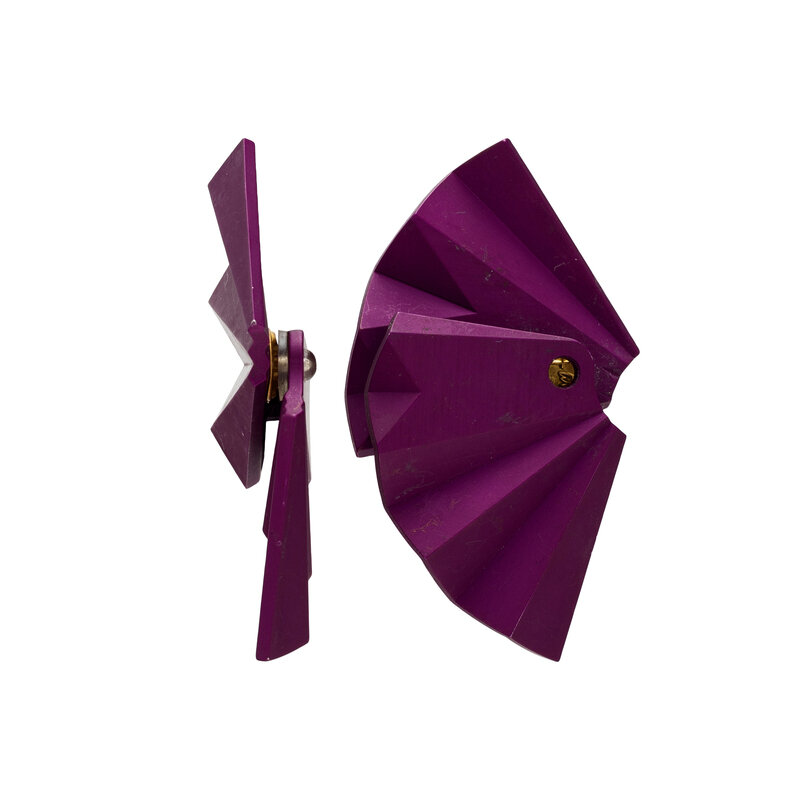 In a folded fan design with matte purple finish. Sculpted aluminum. 1 1/2 inches long.