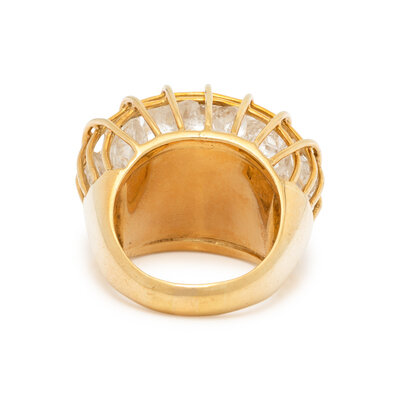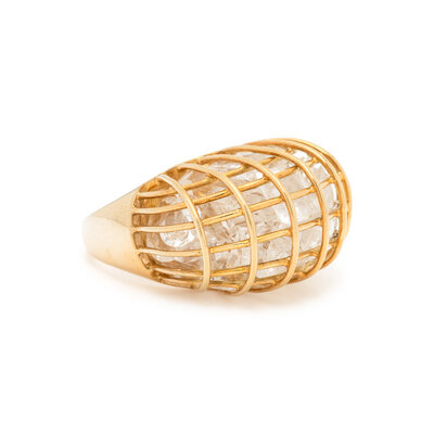 In a domed caged design, filled with an array of round, oval, baguette, marquise, and emerald cut rock crystal quartz. Mounted in yellow gold. Ring size 8 1/2.